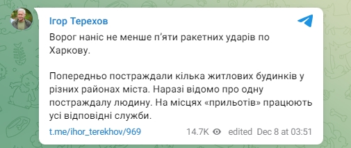 "Враг нанес не менее пяти ракетных ударов по Харькову. Предварительно пострадали несколько жилых домов в разных районах города. Пока известно об одном пострадавшем человеке. На местах прилетов работают все соответствующие службы", - написал Терехов.