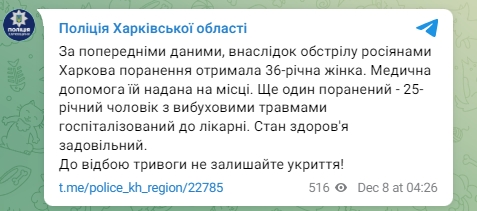 "По предварительным данным, в результате обстрела россиянами Харькова ранения получила 36-летняя женщина. Медицинская помощь ей оказана на месте. Еще один раненый - 25-летний мужчина со взрывными травмами госпитализирован в больницу. Состояние здоровья удовлетворительное", - говорится в сообщении Нацполиции.