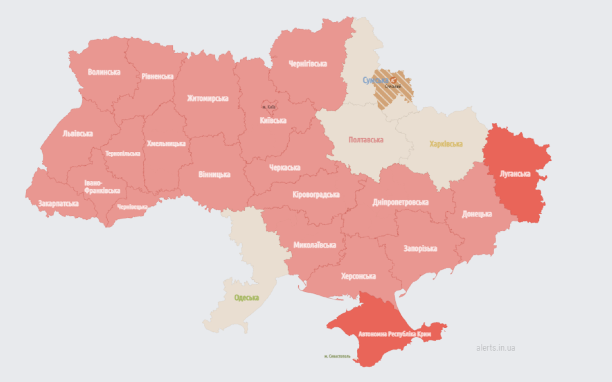 По состоянию на 9:15 воздушная тревога объявлена по всей Украине кроме Сумской, Полтавской и Харьковской областей.