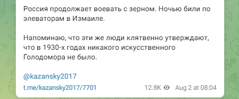 "Россия продолжает воевать с зерном. Ночью били по элеваторам в Измаиле. Напоминаю, что эти же люди клятвенно утверждают, что в 1930-х годах никакого искусственного Голодомора не было", - написал Казанский.