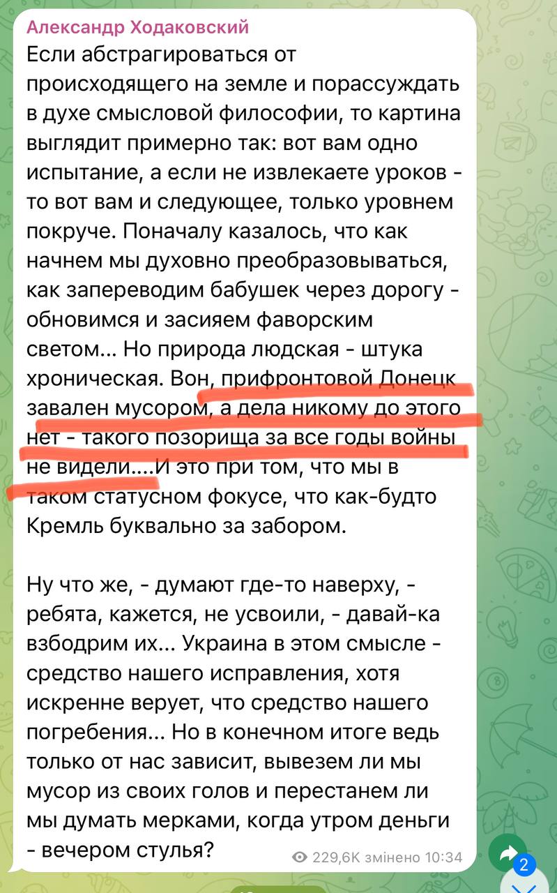 "Полевой командир "ДНР" Ходаковский заявил, что Донецк завален мусором, который никто не вывозит. В Украине город содержали в чистоте. Теперь же и сами сторонники РФ признают, что Россия превратила Донецк в помойку", - отметил Казанский.
