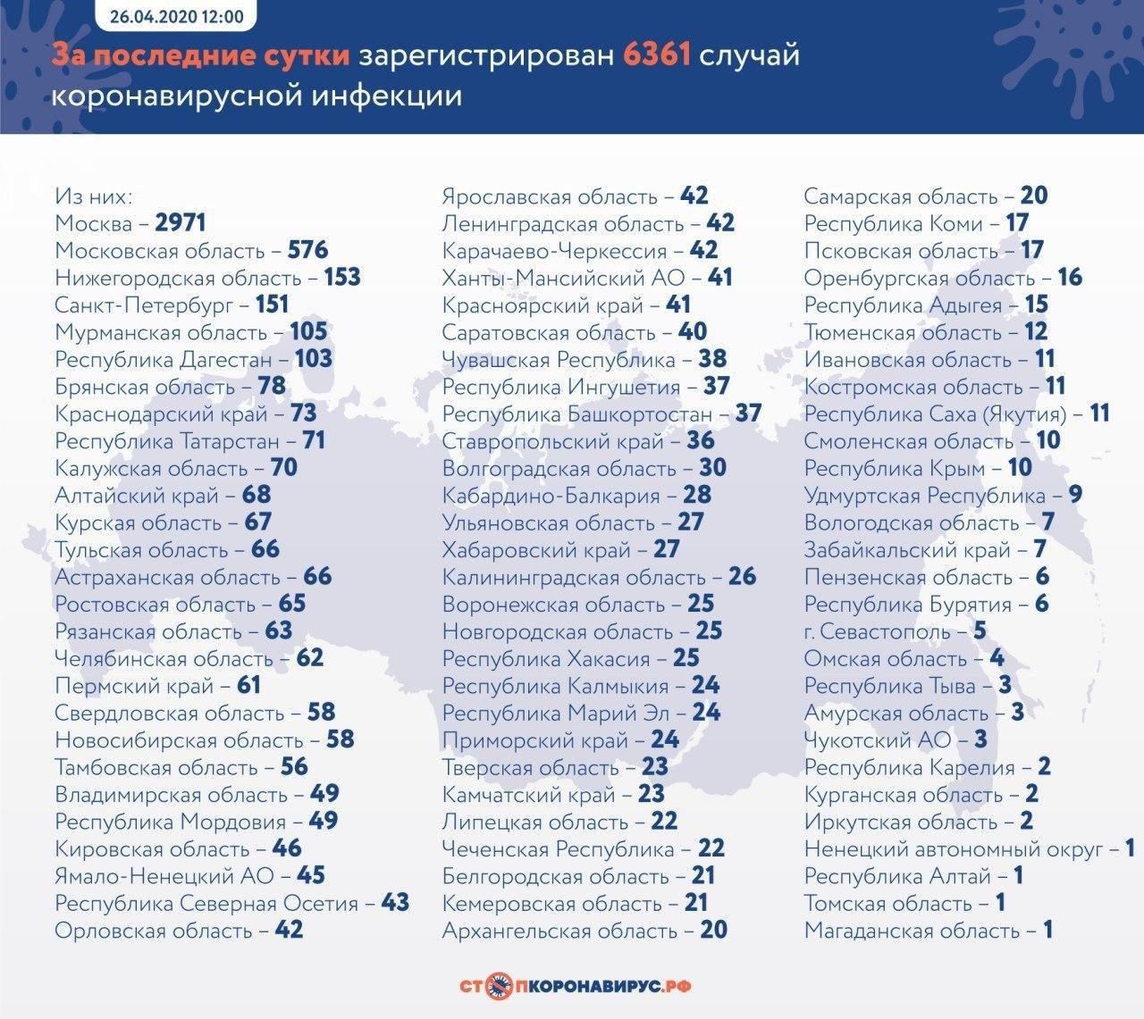 По состоянию на утро 26 апреля в Российской Федерации зарегистрировано 80 949 заболевших в 85 регионах, сообщают в местном Минздраве.