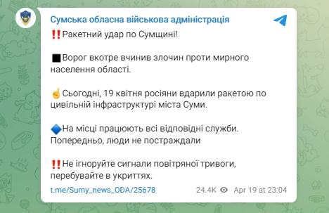 "Ракетный удар по Сумщине! Враг в очередной раз совершил преступление против мирного населения области. Сегодня, 19 апреля, россияне ударили ракетой по гражданской инфраструктуре города Сумы. На месте работают все соответствующие службы. Предварительно, люди не пострадали", - говорится в сообщении Сумской ОВА.