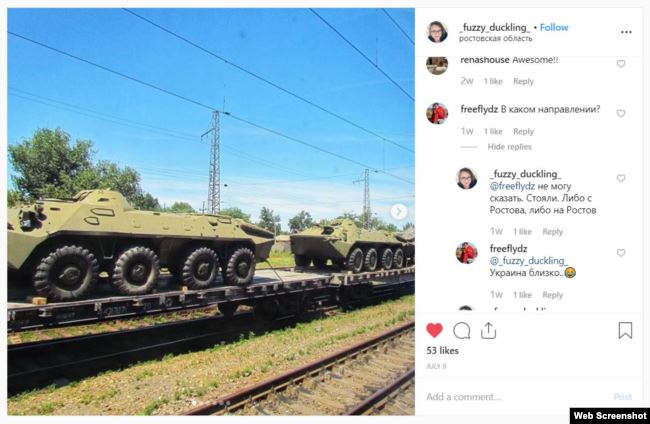 В соцсети Instagram с геометки "Ростовская область" пользовательница выложила фотоотчет о путешествии по железной дороге. На первом снимке - железнодорожные платформы с бронетранспортерами.