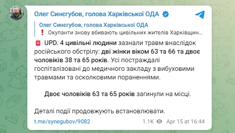 "4 гражданских человека получили травмы в результате российского обстрела: две женщины в возрасте 63 и 66 и двое мужчин 38 и 65 лет. Все пострадавшие госпитализированы в медицинское учреждение с взрывными травмами и осколочными ранениями. Двое мужчин 63 и 65 лет погибли на месте", - написал Синегубов.
