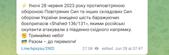 "Ночью 28 июня 2023 года противовоздушной обороной Воздушных Сил и других составляющих Сил обороны Украины уничтожены шесть баражирующих боеприпасов Shahed-136/131, которыми российские оккупанты атаковали с юго-восточного направления", - отмечается в сообщении.