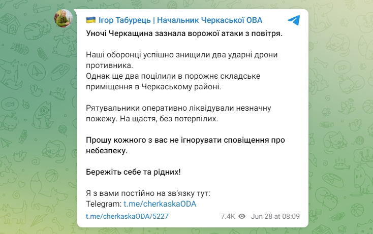 Начальник Черкасской ОВА Игорь Табурец сообщил, что ночью было уничтожено 2 БПЛА, но еще 2 попали в пустое складское помещение. Жертв и пострадавших нет.