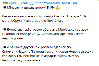 В Днепропетровской ОВА сообщили, что подразделения ПВО сбили два вражеских "шахеда".