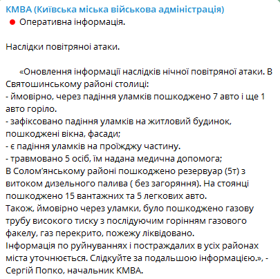 По информации КМВА в Святошинском районе столицы, вероятно, из-за падения обломков повреждено 7 авто и еще 1 авто горело, зафиксировано падение обломков на жилой дом, повреждены окна, фасады; есть падение обломков на проезжую часть. В результате атаки травмированы 5 человек, им оказана медицинская помощь;