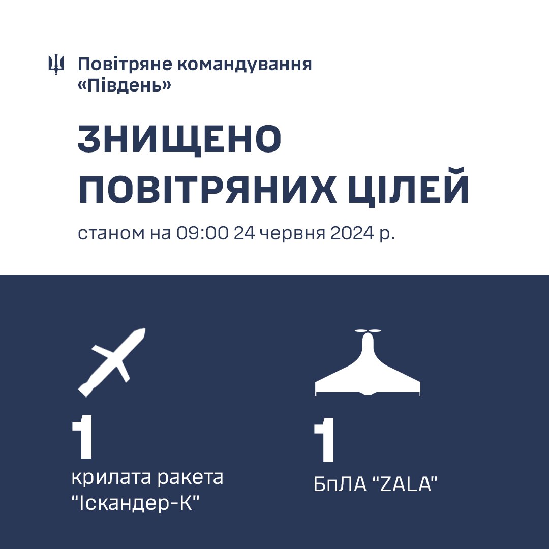 В Воздушных Силах ВС Украины сообщили, что утром, 24 июня, российские оккупанты атаковали Одесскую область двумя крылатыми ракетами, вероятно "Искандер-К".