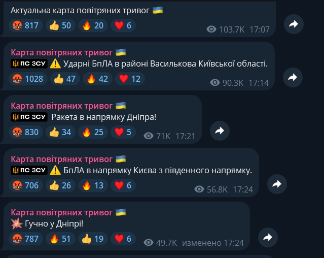 "Ударные БпЛА в районе Василькова Киевской области. Ракета в направлении Днепра! БпЛА в направлении Киева с южного направления. Громко в Днепре!", - говорится в сообщениях в паблике.