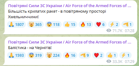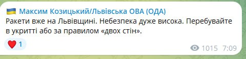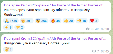 07.47. Зафиксировано движение ракет по направлению к Львовской и Полтавской областям.