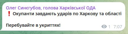 07.41. Глава Харьковской ОГА Олег Синегубов сообщил, что оккупанты нанесли минимум 4 удара по Харькову. В настоящее время – без пострадавших. В г. Змиев Чугуевского района зафиксировано попадание в частный дом. Медики оказывают помощь двум пострадавшим, по предварительным данным, под завалами находятся еще два человека.