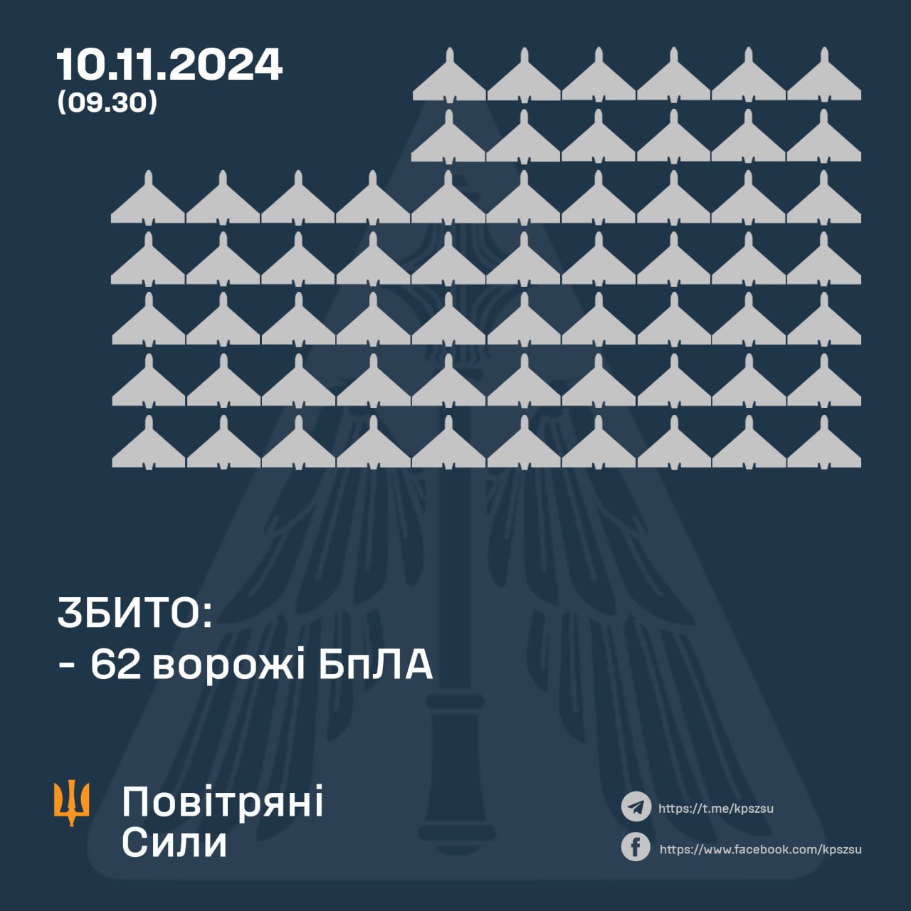 "По состоянию на 09.30 подтверждено сбитие 62-х БПЛА противника в Одесской, Киевской, Житомирской, Харьковской, Полтавской, Сумской, Винницкой, Хмельницкой, Черниговской, Днепропетровской, Николаевской, Запорожской и Донецкой областях.