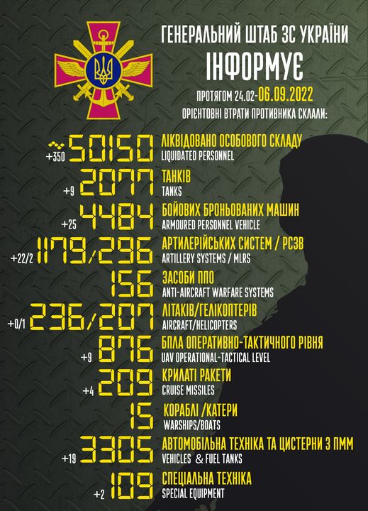 Общие боевые потери противника с 24.02 по 06.09 ориентировочно составили: