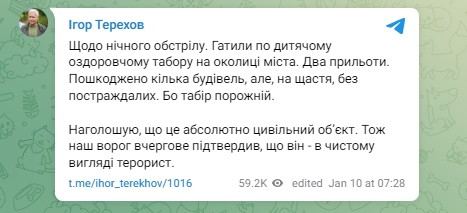 "Относительно ночных обстрелов. Гатили по детскому оздоровительному лагерю на окраине города. Два прилета. Повреждено несколько построек, но, к счастью, без пострадавших. Потому что лагерь пуст. Отмечаю, что это абсолютно гражданский объект. Поэтому, наш враг в очередной раз подтвердил, что он - в чистом виде террорист", - написал Терехов.