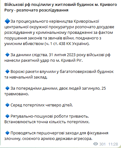 В понедельник, 31 июля, российские оккупационные войска, после обстрела Харькова, нанесли ракетный удар по Кривому Рогу. По предварительной информации, две баллистические ракеты попали в здание одного из учебных заведений и жилую многоэтажку. Погибли четыре человека, 43 человека получили ранения.