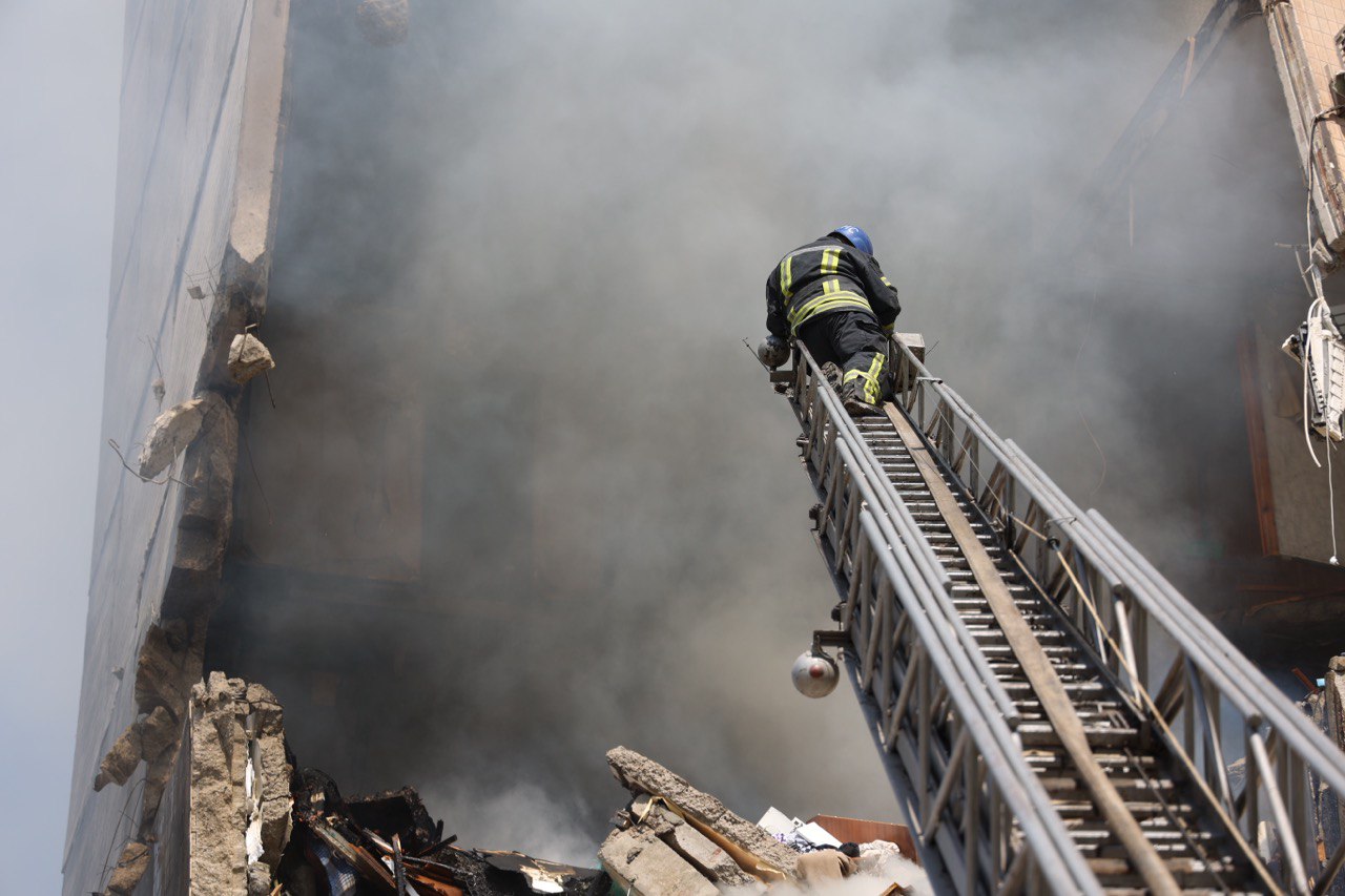 Вторая ракета разрушила секцию с 4 по 9 этажа жилого дома. Возник пожар.