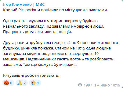 Впоследствии в МВД сообщили, что в Кривом Роге одна ракета попала в четырехэтажное здание учебного заведения.