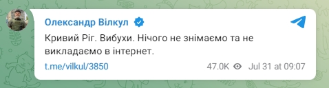 "Кривой Рог. Взрывы. Ничего не снимаем и не выкладываем в интернет", - написал глава Криворожской ОВА Александр Вилкул.