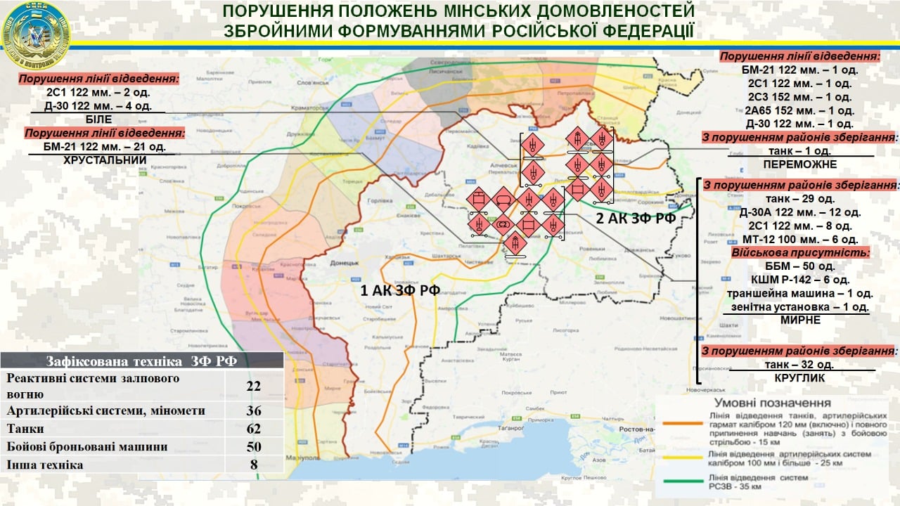 Так, 3 февраля было обнаружено 205 единиц вооружения и военной техники, а за прошедшие сутки дополнительно обнаружено и зафиксировано размещение на временно оккупированной территории 178 единиц военной техники "2 армейского корпуса" вооруженных формирований РФ, которая размещена с нарушением Минских договоренностей.