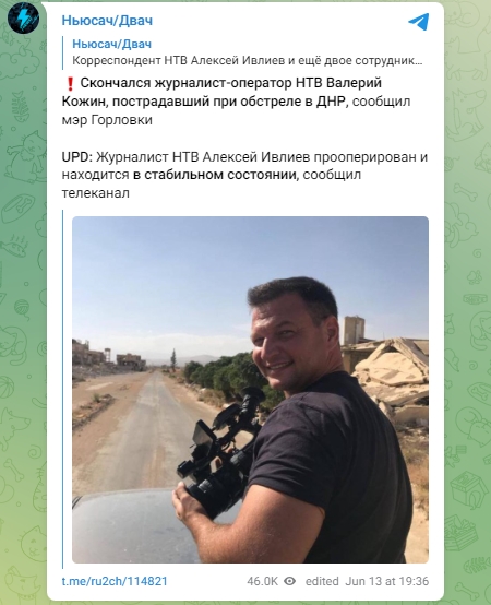 Позже стола известно, что не выжил оператор НТВ Валерий Кожин, который попал под обстрел возле Горловки.