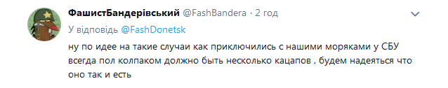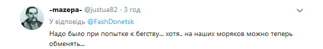 "Надо было при попытке к бегству... хотя.. на наших моряков можно теперь обменять…", "Кацапстан их на наших моряков не поменяет. Потому, что мы признаем наших ребят военнопленными, а мокши своих - ихтамнетами...", "Свиньи! С новым годом, свиньи!", "ну по идее на такие случаи, как приключились с нашими моряками у СБУ, всегда под колпаком должно быть несколько кацапов, будем надеяться, что оно так и есть", - в таком духе пишут комментаторы.