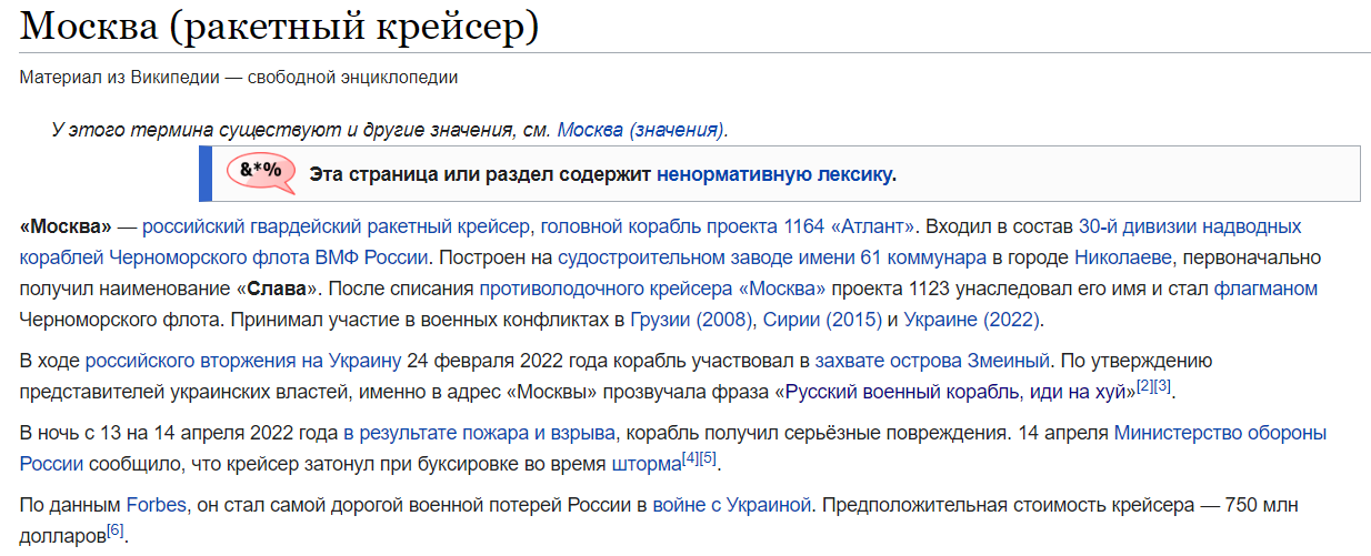 В "Википедии" появилось подтверждение того, что ракетный крейсер "Москва" действительно пошел ко дну вследствие его обстрела украинскими военными.