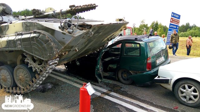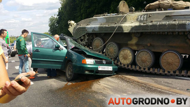 В Гродно (Беларусь) БМП вылетела на встречную полосу, где столкнулась с гражданским автомобилем.