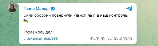 "Силы обороны вернули Равнополь под наш контроль. Движемся дальше", – написала Маляр.