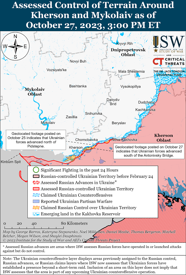 Согласно информации ISW, 27 октября украинские войска совершили небольшое продвижение на восточном (левом) берегу Херсонской области. Они также продолжили продвижение к югу под Антоновским автомобильным мостом к северу от Олешек.