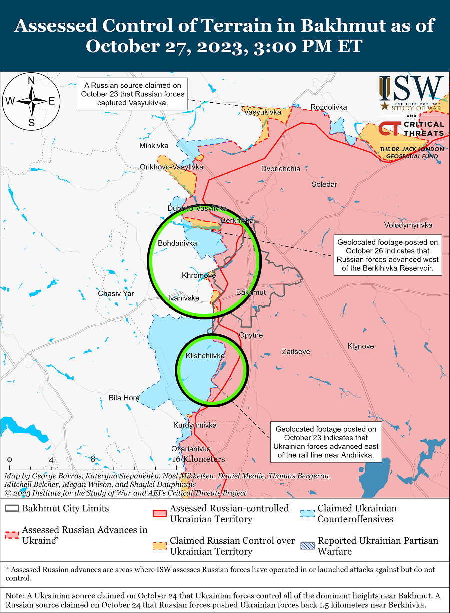 27 октября русские войска продолжили ограниченные наступательные действия под Бахмутом и подтвердили свои успехи. 26 октября русские войска продвинулись к югу от Береховского водохранилища и добились небольших успехов на западе от Курдюмовки.