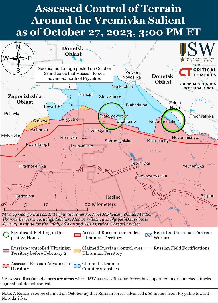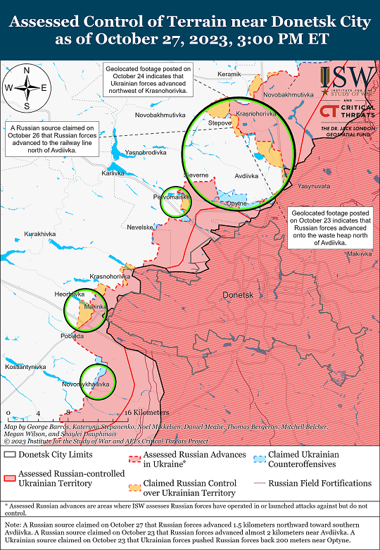 По данным института, 27 октября, российские войска продолжали осуществлять наступательные операции к юго-западу от Донецка, однако не добились никаких подтвержденных успехов. Генштаб сообщил, что украинские силы отразили более 19 российских атак вблизи Марьинки и Новомихайловки.