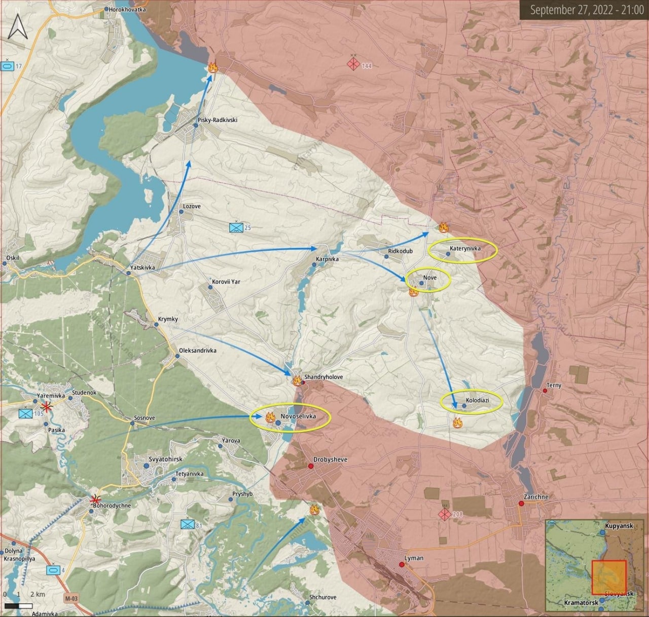 В течение минувших суток, 27 сентября, украинские силы продвигались в сторону Луганской области и освобождали один населенный пункт за другим. Ситуация для российских сил, удерживающих Лиман, становится критической.
