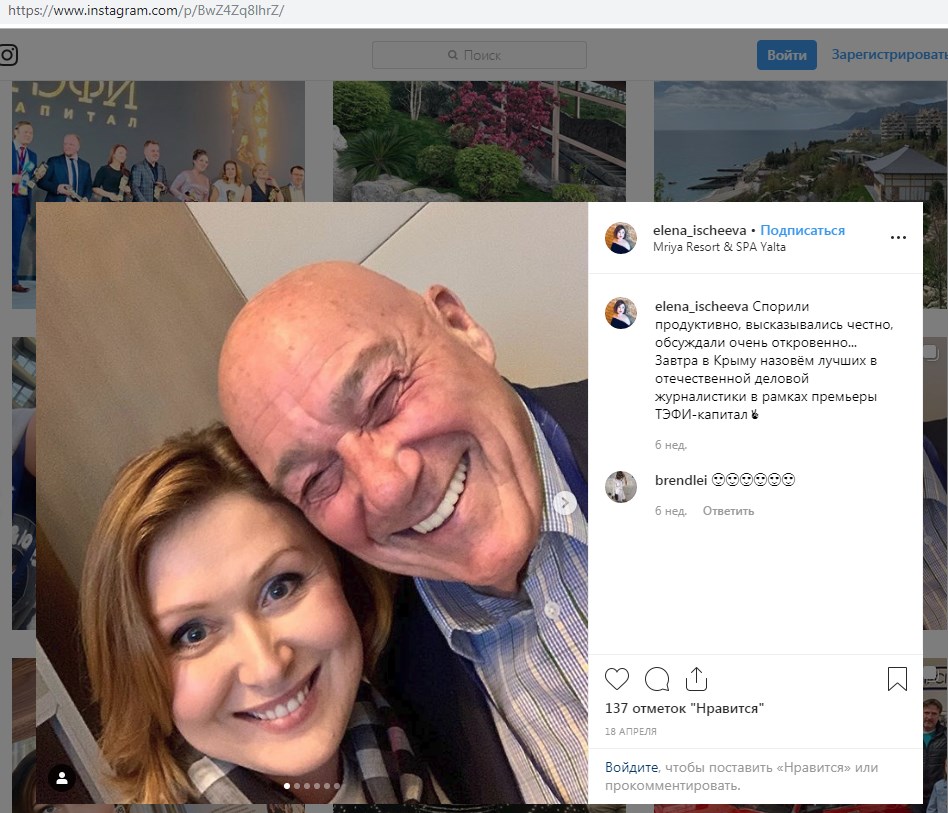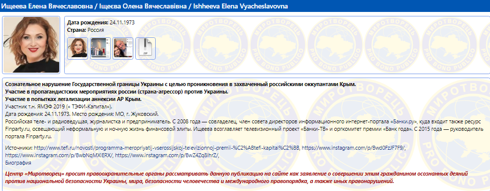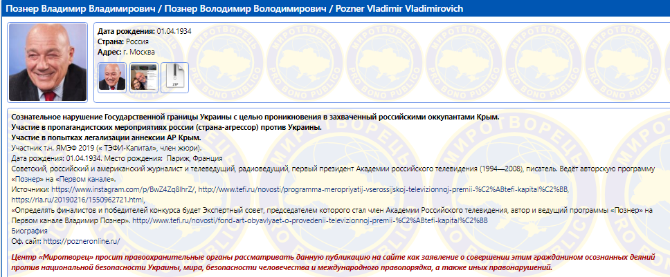 При этом, согласно снимкам и предоставленной информации, Познер посещал Крым вместе с журналисткой и телеведущей Еленой Ищеевой, которая также попала в базу.