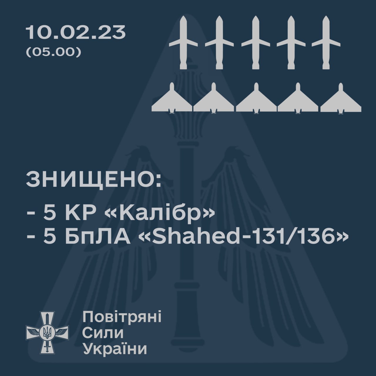 В ночь на пятницу, 10 февраля, российские оккупационные войска в очередной раз атаковали Украину ракетами – силами украинской ПВО было уничтожено 5 дронов-камикадзе и 5 "Калибров".
