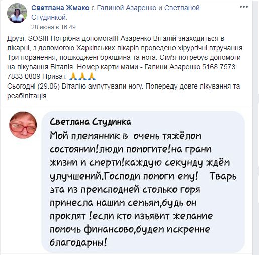 Пострадавшему Азаренко из Барвинково 29 июня из-за травмы ампутировали ногу. Сейчас друзья и родные собирают деньги, чтобы помочь в лечении и реабилитации. Его тетя написала в соцсети: "Мой племянник находится в тяжелом состоянии, каждый день на грани жизни и смерти, каждую секунду ждем улучшений".