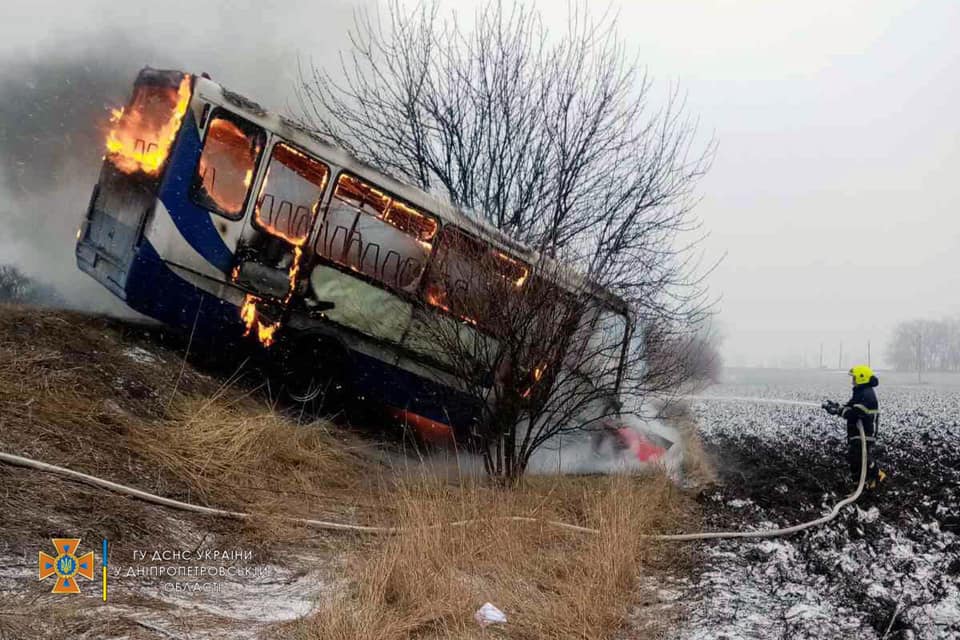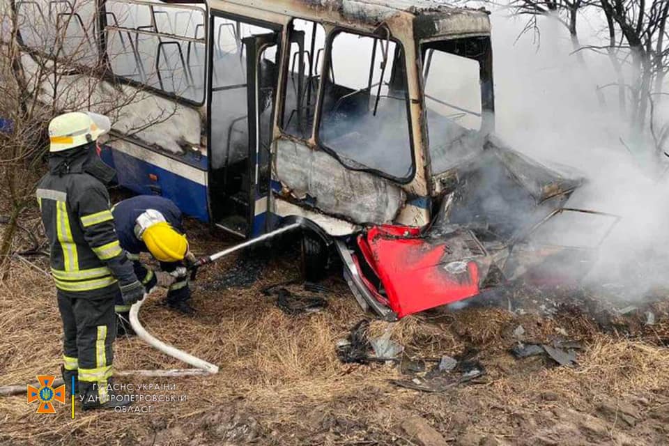 Трагедия случилась в 08:34 между селами Песчанка и Новоселовка Новомосковского района - автобус с пассажирами выполнял рейс от Новомосковска до Знаменовки и ехал по автодороге М-04 "Знамянка-Луганск-Изварино". Он столкнулся с легковым автомобилем ВАЗ-2101, в результате чего оба транспортных средства загорелись.