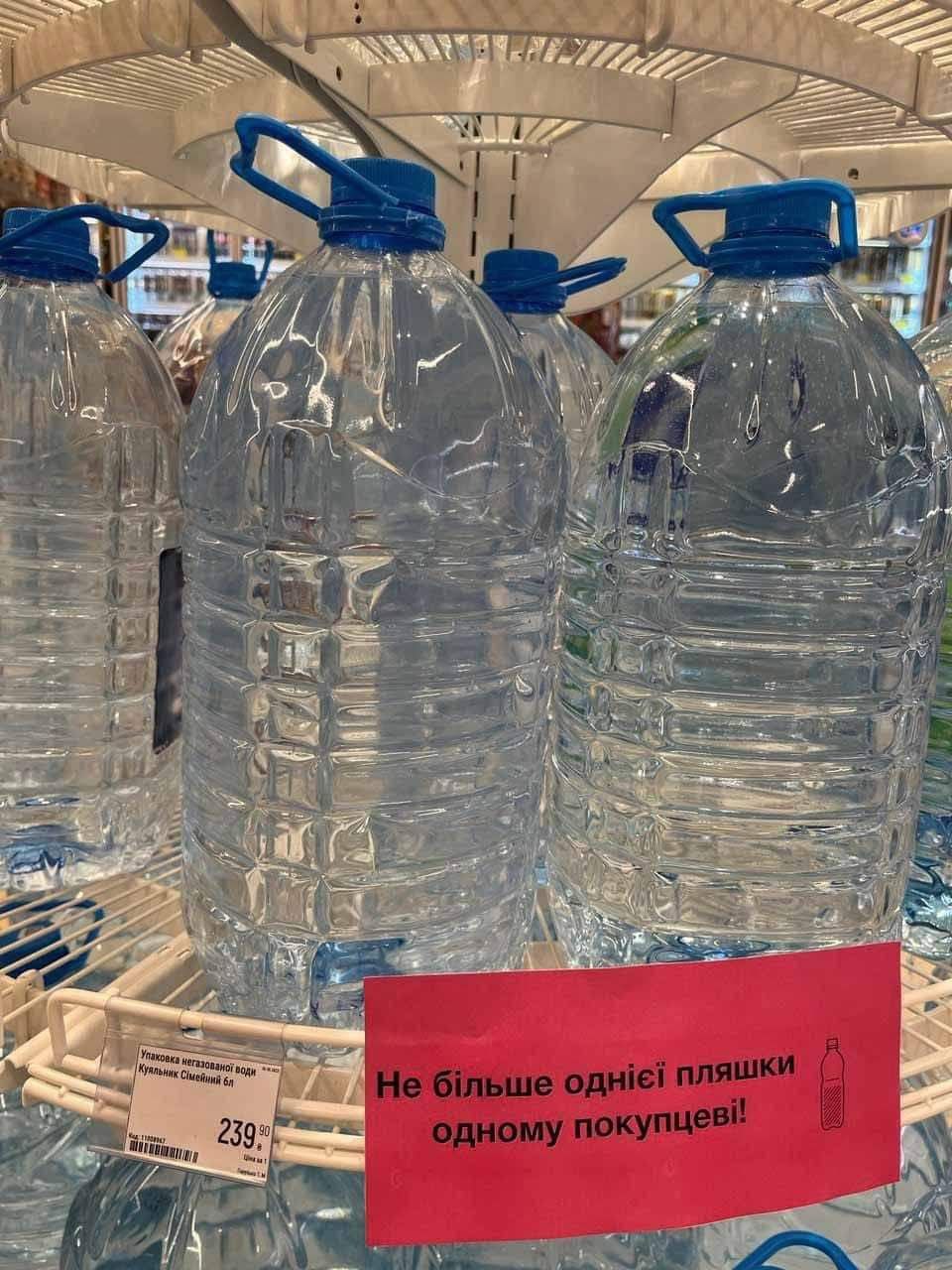 Так, за пятилитровый бутыль питьевой воды просят заплатить 239 грн, причем больше одной бутылки в одни руки не продают.