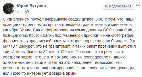 "Это 9М113 "Конкурс", это не гранатомет. И таких ракет противник выпустил три. И мины были не 82 мм, а 120 мм. Повезло, что в результате обстрела жертв не было. К сожалению, не последовало и наших адекватных действий в ответ на это нападение - возможно, это результат неточного информирования", - написал Бутусов и опубликовал фото.