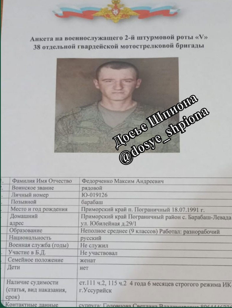 "У россиян на Запорожском направлении сразу минус 10 оккупантов, если верить телеграмм-каналу "Досье шпиона". По версии канала, который пока является единственным источником информации о случае, российских военных расстрелял "свой", ранее судимый 33-летний Федорченко Максим Андреевич, позывной "Барабаш". Он забросил гранату в блиндаж, а затем открыл там огонь".