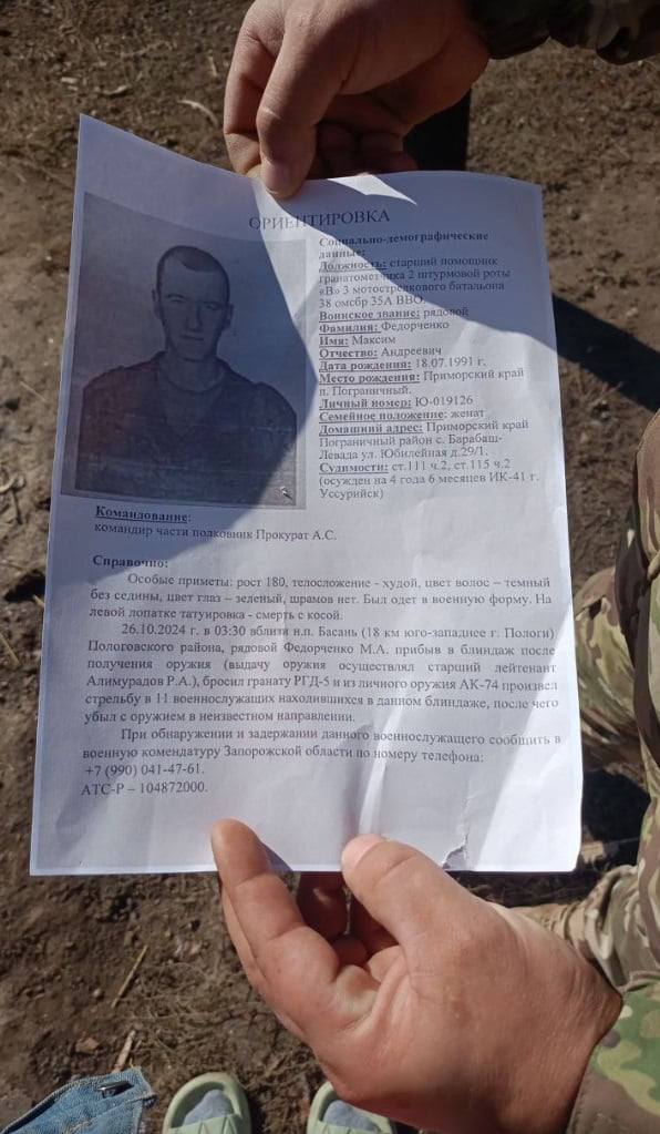 Согласно сообщению, в ночь на 26 октября в районе н.п. Новопокровка Запорожской области Федорченко вроде как расстрелял десятерых спящих военнослужащих своего подразделения и скрылся в направлении н.п. Пологи.