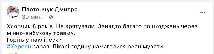 В результате сегодняшних обстрелов Херсона от минно-взрывной травмы погиб 8-летний мальчик.