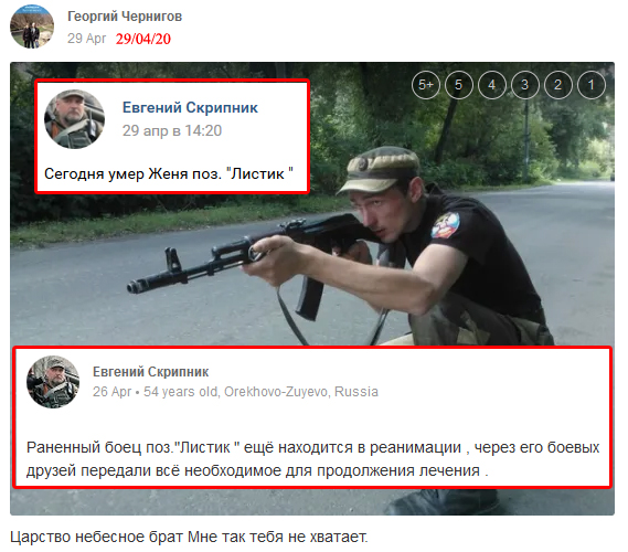 "Карелин Евгений Николаевич "Лист" умер от ранений 29 апреля 2020 года", - отмечается в сообщении.