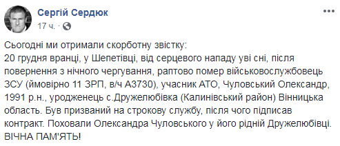 20 декабря в Хмельницкой области от сердечного приступа во сне умер украинский военнослужащий Александр Чуловский.
