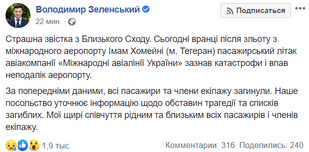 "Страшная весть с Ближнего Востока. Сегодня утром после взлета из международного аэропорта Имам Хомейни (г. Тегеран) пассажирский самолет авиакомпании "Международные авиалинии Украины" потерпел катастрофу и упал недалеко от аэропорта. По предварительным данным, все пассажиры и члены экипажа погибли", - отметил Зеленский.