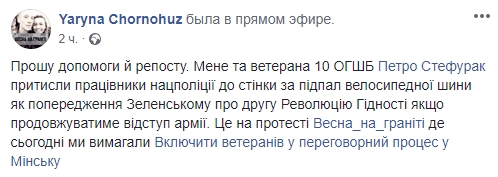 "Прошу помощи и репост. Меня и ветерана 10 ОГШБ Петра Стефурака прижали работники нацполиции к стенке за поджог велосипедной шины как предупреждение Зеленскому о второй Революцию Достоинства если продолжать отступление армии. Это на протесте Весна на граните, где сегодня мы требовали включить ветеранов в переговорный процесс в Минске", - пишет Черногуз.