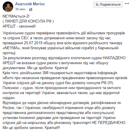 "Объясняю – судно, после прохождения им пограничного и таможенного контроля на территории Украины, считается таким, что имеет открытую границу. Согласно норм действующих международных договоров, ратифицированных как Россией, так и Украиной, необходимости получения согласия или разрешения представителя дипломатического представительства или консульского учреждения иностранного государства для проведения на территории Украины следственных действий на морском или речном транспорте не предусмотрено", - пояснил главный военный прокурор.
