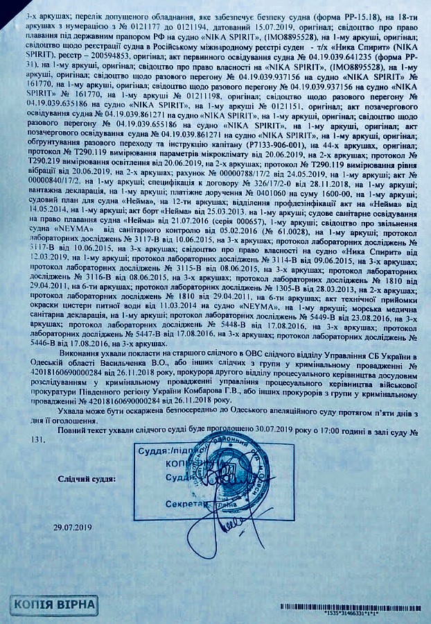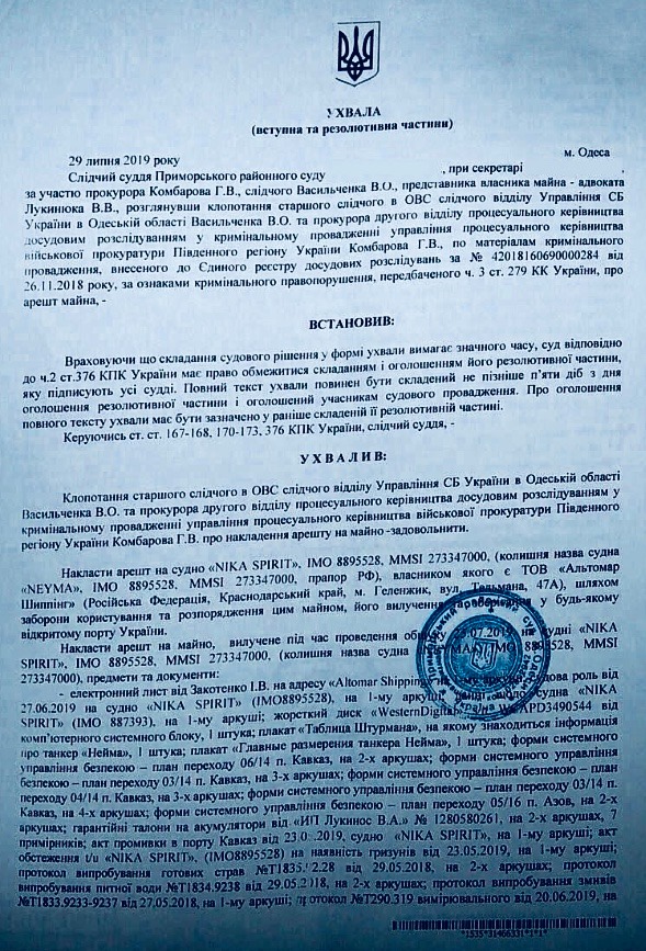 Суд наложил арест на российский танкер NEYMA, который блокировал украинские корабли в Керченском проливе в ноябре 2018 года.
