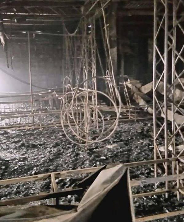 На фото видно, что здание очень сильно пострадало в результате пожара. Выгорело практически все, что только было возможно. Стены, потолок и пол покрылись большим слоем гари.